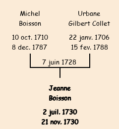 Mère : Urbaine Gilbert Collet | Marraine : Jeanne Gilbert Collet (fille de Jean) |