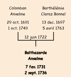 Mère : Barthélémie Claraz Bonnel | Marraine : Balthazarde Anselme (fille de Laurent) |