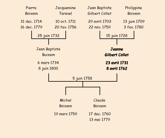 Mère : Philippine Boisson | Marraine : Jeanne Gilbert Collet (fille du parrain) |
