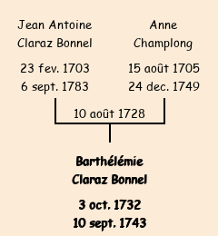 Père : Jean Antoine Claraz Bonnel | Parrain : Gaspard Champlong (fils de Jean Pierre) |