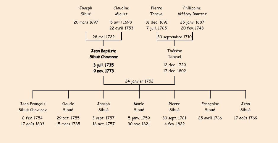 Père : Joseph Sibué Chavonaz | Parrain : Jean Pierre Opinel (fils de Jean Pierre décédé, d'Albiez le Vieux) |