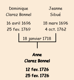 | Mère : Jeanne Sibué | Marraine : Anne Claraz Bonnel (fille de Louis décédé, soeur du parrain) |