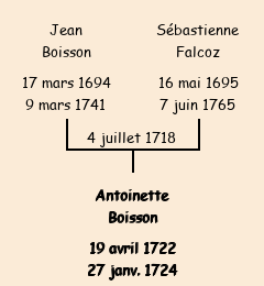 | Mère : Sébastienne Falcoz | Marraine : Antoinette Vincent (épouse d'Antoine Boisson) |