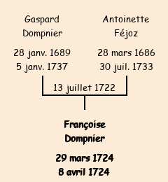 Mère : Antoinette Féjoz | Marraine : Françoise Bernard (veuve du dit Sébastien Dompnier) |