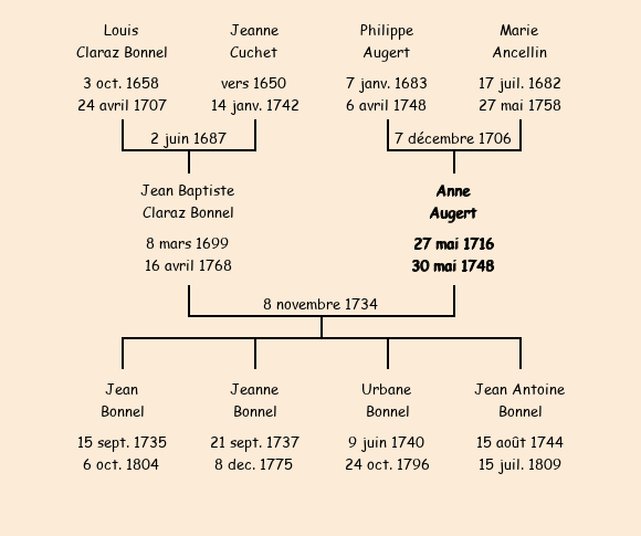 Mariée (18 ans) avec Jean Baptiste Claraz Bonnel (35 ans) le 8 novembre 1734 à Fontcouverte ![]() |