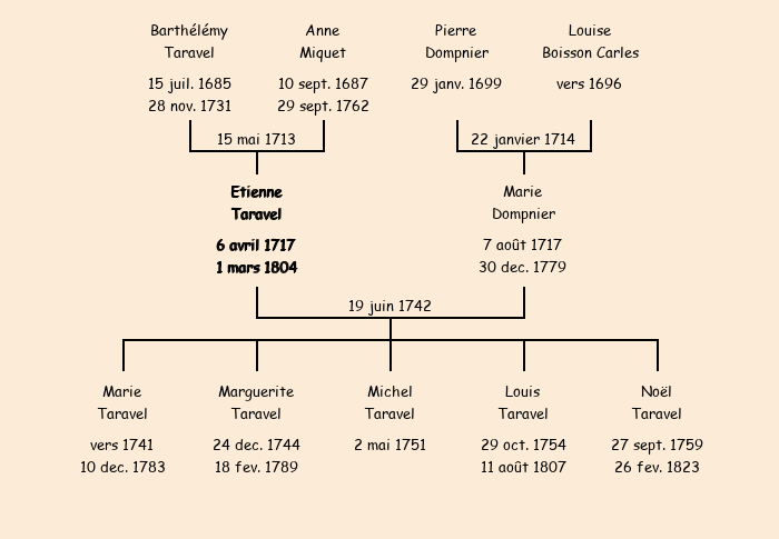 Père : Barthélémy Taravel | Parrain : Etienne Miquet (fils de Jean Claude, frère de la marraine) |
