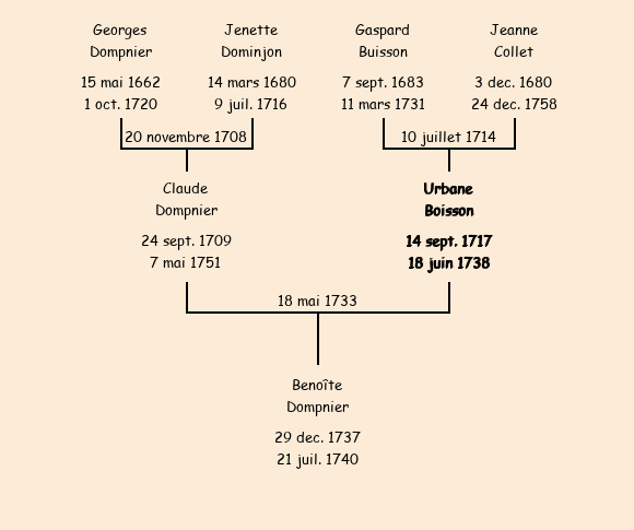 Mariée (15 ans) avec Claude Dompnier (23 ans) le 18 mai 1733 à Fontcouverte ![]() |