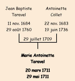 | Mère : Antoinette Gilbert Collet | Marraine : Antoinette Arnaud (épouse du dit Pierre Taravel) |