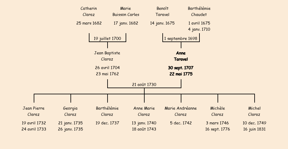 Mariée (22 ans) avec Jean Baptiste Claraz (26 ans) le 21 août 1730 à Fontcouverte ![]() |