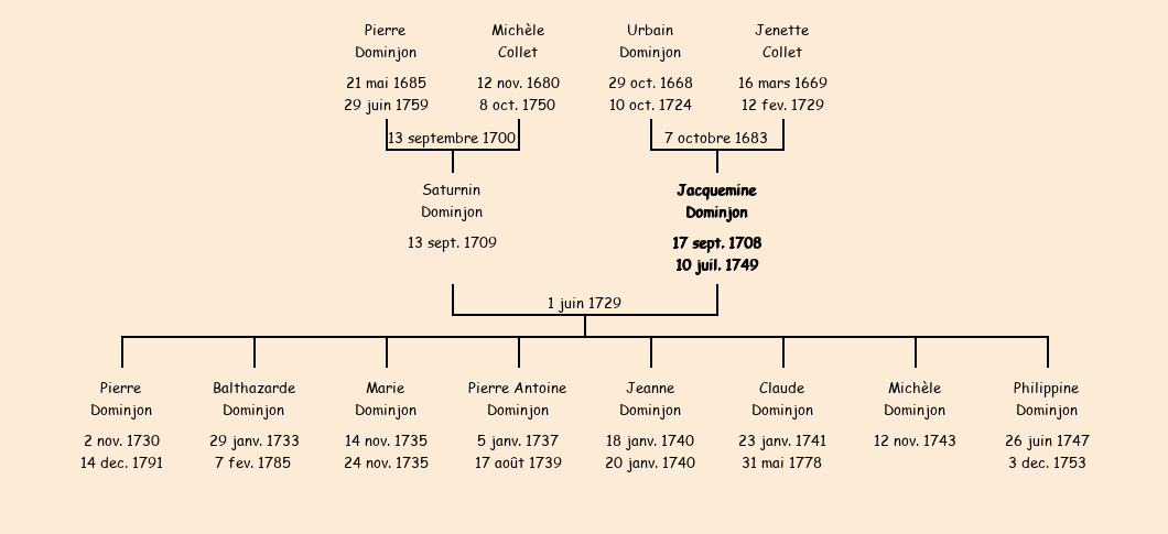 Jacquemine Dominjon apparait dans le recensement de la population de 1716. |