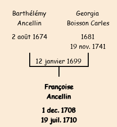 A comme mère une Georgia Duverney Guichard. Or le mariage en 1699 indique une Georgia Boisson Carles de Villarembert. Puis trois enfants sont dits de Georgia Duverney Guichard (entre 1708 et 1712) puis les deux derniers à nouveau de Georgia Boisson Carles (entre 1716 et 1720)... |
