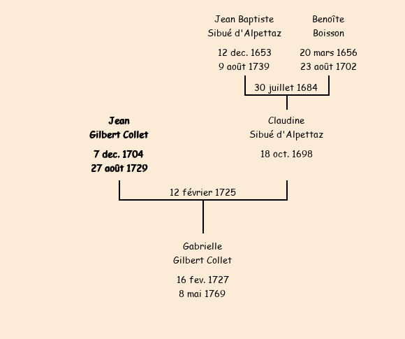 Marié (20 ans) avec Claudine Sibué d'Alpettaz (26 ans) le 12 février 1725 à Fontcouverte ![]() |