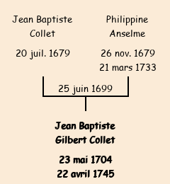 Mère : Philippine Anselme | Marraine : Louise Gilbert Collet (fille d'un autre Jean Bapiste) |