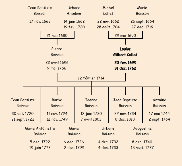 | Mère : Marie Boisson | Marraine : Louise Gilbert Collet (épouse d'Antoine Boisson) |