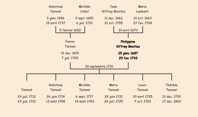 | Philippine Viffrey Bouttaz apparait dans le recensement des personnes de Fontcouverte et de leurs bestiaux de 1734. |