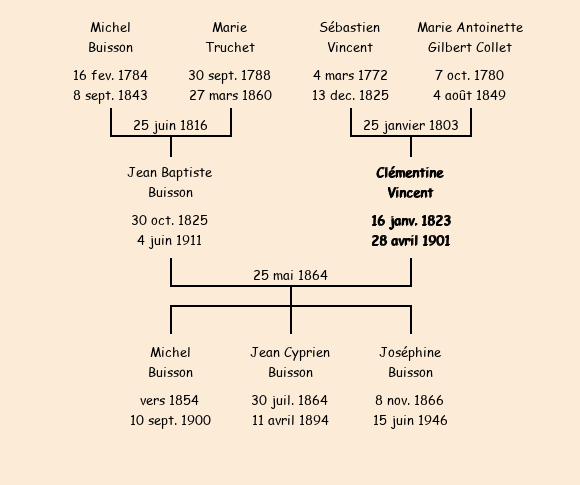 Epouse : Clémence Vincent (41 ans, née le 16 janvier 1823, des Anselmes, cultivatrice, n'a pas su signer), fille de Sébastien (décédé le 13 décembre1825) et de Marie Collet (décédée à Saint Jean le 4 août1849) |