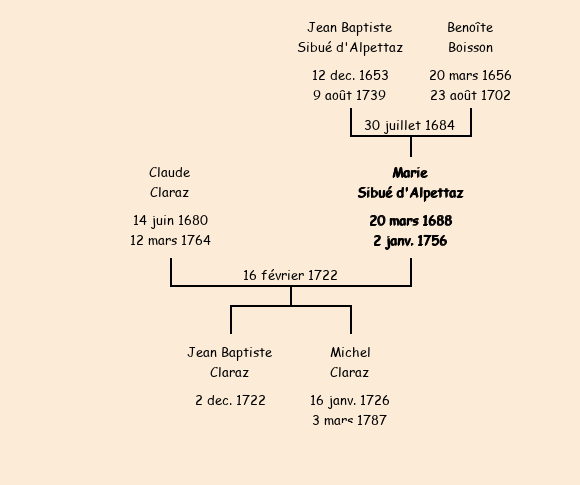 Mariée (33 ans) avec Claude Claraz (41 ans) le 16 février 1722 à Fontcouverte ![]() |