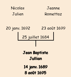 Père : Nicolas Julien (d'Albiez le Vieux) | Parrain : Jean Baptiste Romettaz (fils de Louis décédé) |