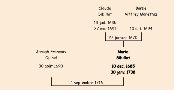 Mariée (30 ans) avec Joseph François Opinel (26 ans) le 1 septembre 1716 à Albiez-Montrond ![]() |