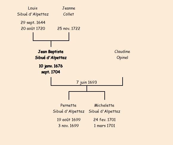 Jean Baptiste Sibué d'Alpettaz apparait dans la consigne des mâles de 1713 (absent). |