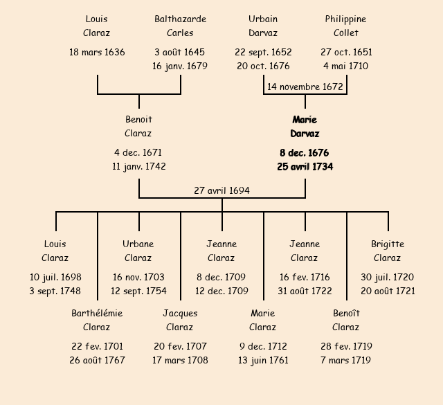 Mariée (17 ans) avec Benoit Claraz (22 ans) le 27 avril 1694 à Fontcouverte ![]() |