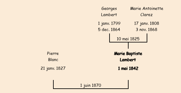 Epouse : Marie Baptiste Lambert (28 ans, née le 1er mai1842 à Fontcouverte, sans profession depuis 6 mois à Saint Jean, a signé), fille de Georges (décédé le 5 décembre1864) et de Marie Antoinette Claraz (décédée le 3 novembre1868) |