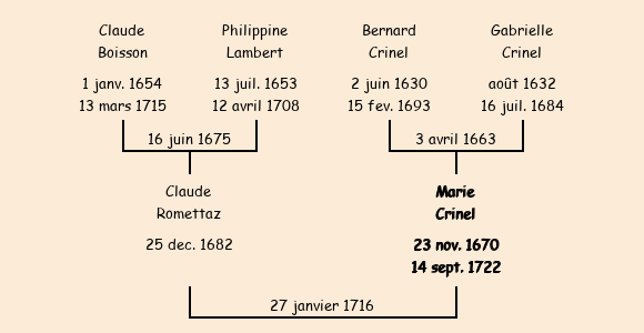 Mariée (45 ans) avec Claude Romettaz (33 ans) le 27 janvier 1716 à Fontcouverte ![]() |