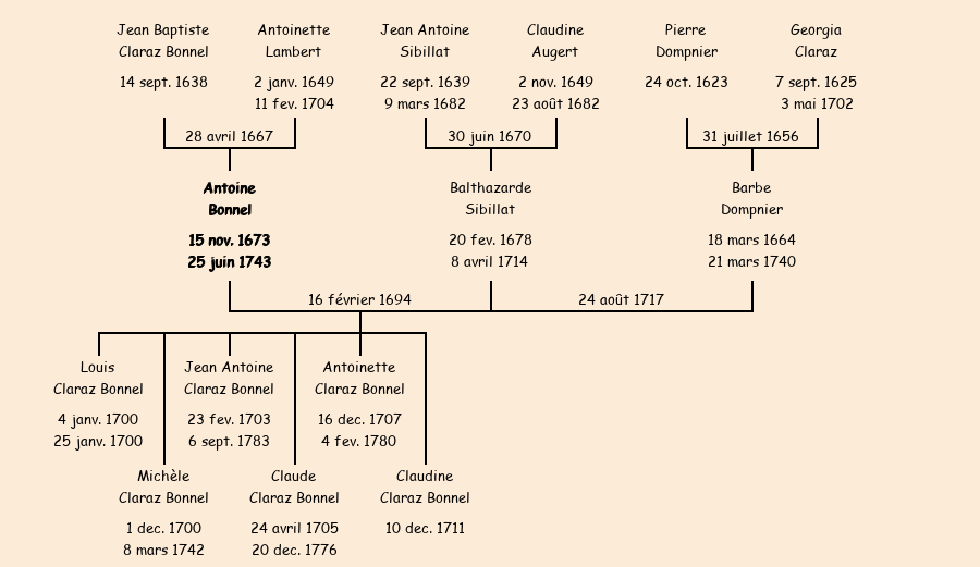 Epoux : Antoine Claraz Bonnel (égrège, veuf de Balthazarde Sibillat), fils de feu Jean Baptiste |