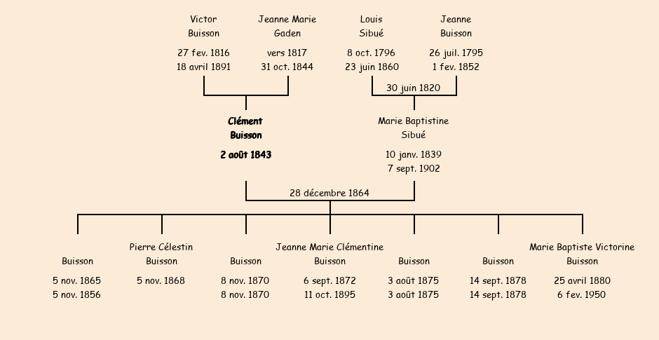 Epoux : Clément Buisson (21 ans, né le 2 août1843, cultivateur à La Rochette), fils de Victor (cultivateur, a signé) et de Jeanne Marie Gaden (décédée le 31 octobre1844) |