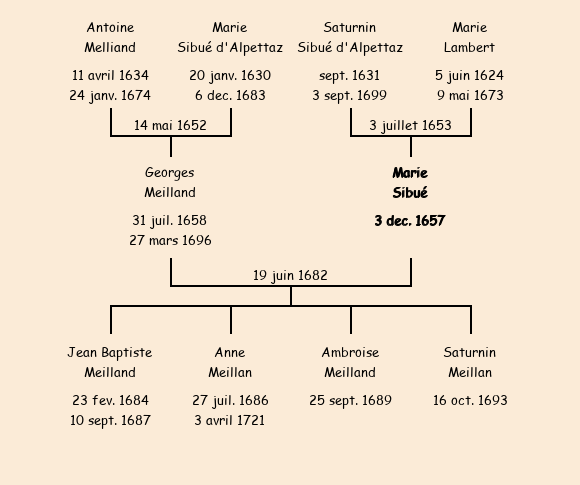 Mariée (24 ans) avec Georges Meilland (23 ans) le 19 juin 1682 à Fontcouverte ![]() |