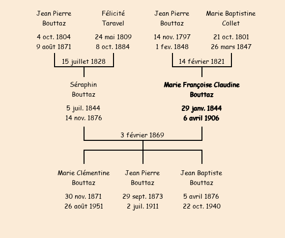 Epouse : Marie Françoise Claudine Bouttaz (25 ans, née le 29 janvier 1844, du Chef Lieu, cultivatrice, n'a pas signé), fille de Jean Pierre (décédé le 1er décembre1848) et de Marie Baptiste Gilbert Collet (décédée le 26 mars1847) |