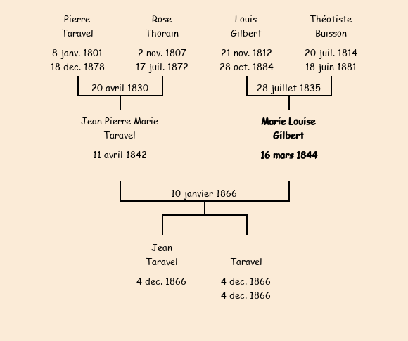 Epouse : Marie Louise Gilbert (21 ans, née le 16 avril1844, de La Rochette, cultivatrice, n'a pas su signer), fille de Louis (cultivateur à La Rochette, a signé) et de Théotiste Buisson (ménagère, n'a pas su signer) |