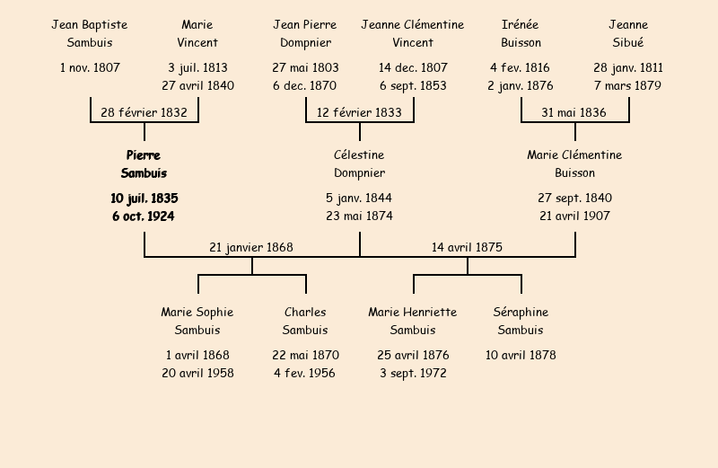 Epoux : Pierre Sambuis (39 ans, né le 10 juillet1835 à Albiez le Vieux, cultivateur à Maison Blanche, veuf de Célestine Dompnier décédée le 23 mai1874 à Fontcouverte, a signé), fils de Jean Baptiste (cultivateur, a signé) et de Marie Vincent (décédée le 27 avril1840 à Albiez le Vieux) |