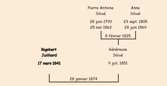 Epoux : Rigobert Juilliard (32 ans, né le 17 mars1841, facteur des postes à Jarrier, habitant Saint Jean, veuf de Marie Flammier de Jarrier décédée le 8 février1873), fils de Victor (meunier à Jarrier) et de Geneviève Marcoz |