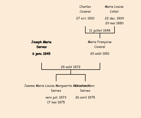 Epoux : Joseph Marie Darves (27 ans, né à Saint Jean de Maurienne le 6 janvier 1845, menuisier en fauteuils à Paris XI° arrondissement, a signé), fils de Marc (garçon d'hôtel à Paris. ) et de Marguerite Girollet (décédée à Saint Jean de Maurienne le 19 mai1849)