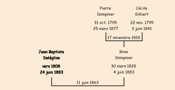 Epoux : Jean Baptiste Deléglise (55 ans, cultivateur, né le 27 novembre1807, famille de Villarembert, a signé), fils de feu Claude et de feue Françoise Deléglise |