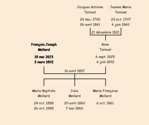 Epouse : Rose Taravel (32 ans, a marqué), fille de Jacques (a marqué) et de Jeanne Marie Taravel |