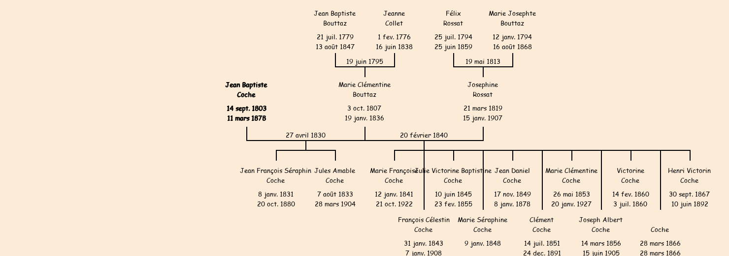 Epoux : Jean Baptiste Coche (de Saint Sorlin d'Arves et habitant depuis 22 ans à Fontcouverte), fils de feu Sorlin et de Anne Marie Thibiéroz (originaires de Saint Sorlin d'Arves et habitant depuis 22 ans à Fontcouverte) |