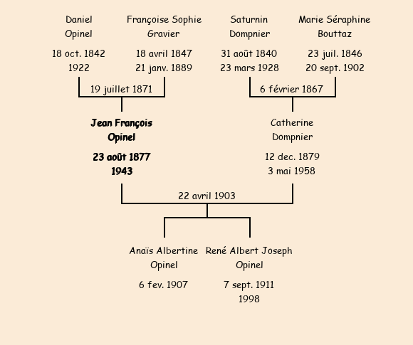 | Epoux : Jean François Opinel (25 ans né le 23 août1877 à Albiez le Vieux hameau de Gévoudaz), fils de Daniel (cultivateur à Gévoudaz) et de Françoise Gravier (décédée le 21 janvier 1889) |