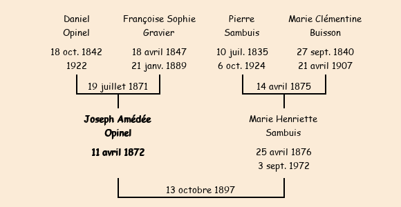 Epoux : Joseph Amédée Opinel (25 ans, né le 11 avril1872 à Albiez le Vieux hameau de Gévoudaz, domicilié à Albiez le Vieux hameau de Gévoudaz, coutelier, a signé), fils de Daniel (coutelier né et domicilié à Albiez le Vieux, a signé) et de Françoise Gravier (décédée le 21 janvier 1889) |