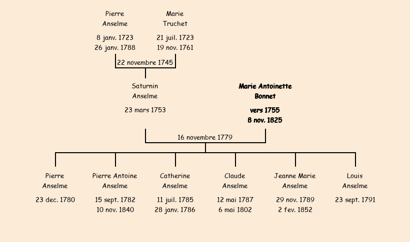 Epouse : Marie Antoinette Bonnet (de Saint Jean), fille de Jean Baptiste et de Claudine Champlong |