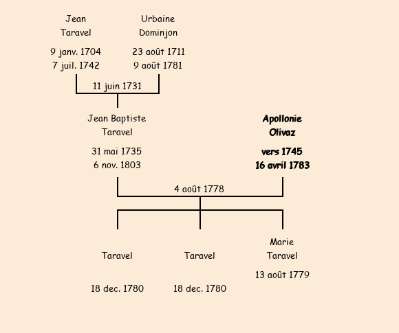 | Epoux : Jean Baptiste Taravel (veuf de Jeanne Marie Gravier), fils de feu Jean |