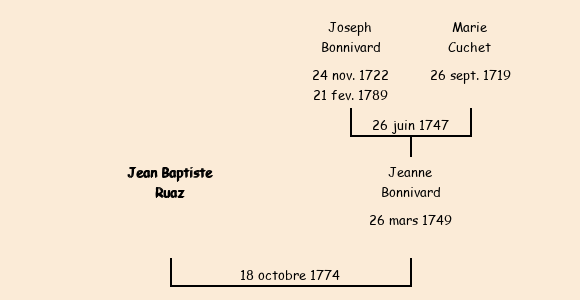 Epoux : Jean Baptiste Ruaz (de Saint Sorlin d'Arves, habitant Saint Jean), fils de feu Joseph |