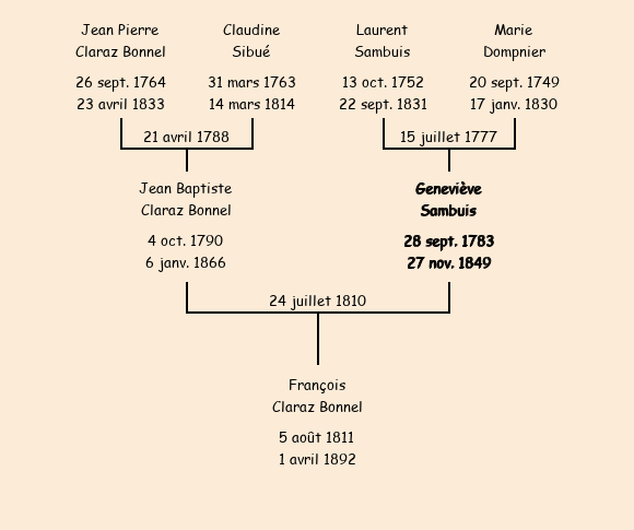 Epoux : Jean Baptiste Claraz Bonnel, fils de Jean Pierre et de Claudine Sibué |