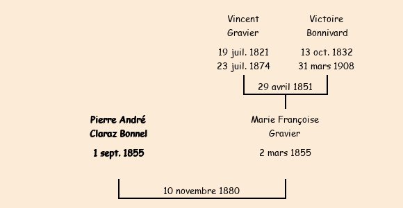 Epoux : Pierre André Claraz Bonnel (25 ans, né le 1er septembre1855 à Albiez le Vieux, cultivateur domicilié à Albiez le Vieux, a signé), fils de Jean Baptiste (décédé le 7 janvier 1866 à Albiez le Vieux) et de Félicité Taravel (ménagère à Albiez le Vieux, n'a pas su signer) |