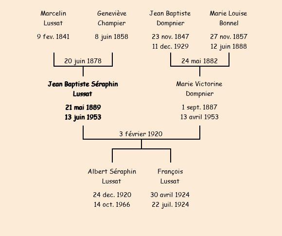 Epoux : Jean Baptiste Séraphin Lussat (né le 21 mai1889 à Saint Pancrace et domicilié à Saint Pancrace), fils de feu Marcellin et de Champier Geneviève (domiciliée à Saint Pancrace) |