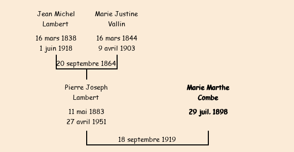 Acte de mariage (archives municipales de Lyon en ligne) : journalière, domiciliée et résidant 25 rue Saint Jean. Fille majeure de Barthélémy Marie et de Marie Henriette Muron, cultivateurs à Sainte-Agathe-la-Bouteresse. |