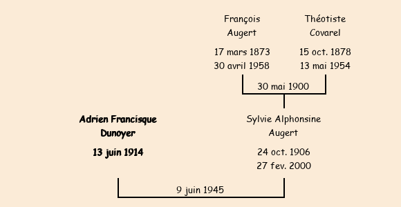 Epoux : Adrien Francisque Dunoyer (30 ans, né à Beaufort le 13 juin1914, domicilié à Beaufort, entrepreneur de travaux publics, veuf de Flora Germaine Perrier), fils de feu Pierre François et de Joséphine Mathilde Chamiot-Clerc |