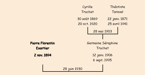 | Epouse : Germaine Séraphine Truchet (24 ans, née à Fontcouverte le 11 janvier 1906, de L'Alpettaz), fille de feu Cyrille et de Théotiste Taravel |