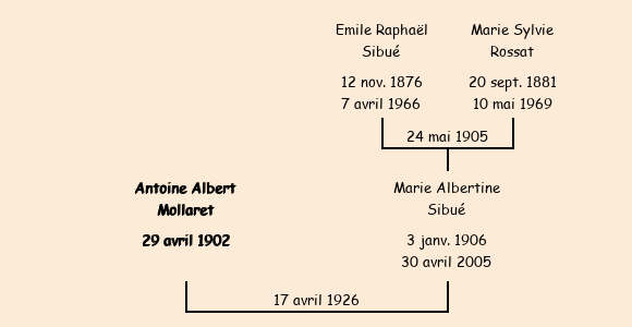 Epouse : Marie Albertine Sibué (20 ans, née à Fontcouverte le 3 janvier 1906, de La Bise), fille de Emile Raphaël et de Marie Sylvie Rossat |